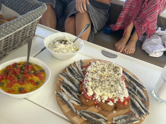翻译:我们参加了全天的游船之旅,感觉棒极了。船上有10个人,人数非常合适。这让我们有时间互相认识,同时也有足够的空间舒适地走动。我们的船长是Forrest和Pascalis,他们让这次体验非常愉快。我们享用了无限畅饮的饮料和丰富的传统希腊美食(早餐、小吃、丰盛的午餐和甜点)。他们非常乐于助人,允许我们遵守一些特定的饮食限制,并且非常体贴。由于风力原因,我们的路线略有调整,但我们仍然度过了美好的一天。我们的集合地点更改了,不过他们提供了前往新集合地点的免费接送服务。