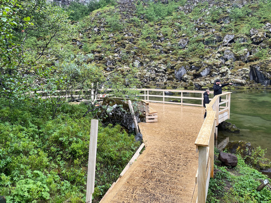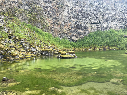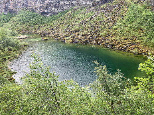 There is also a road that enters the canyon, ending at a small carpark near the lake at the southern end. The lake waters are crystal clear. You can see quite a few Artic Char swimming around. The cliffs that bend around the lake are home to numerous nesting birds as well. There are free toilets to use at the carpark here as well.