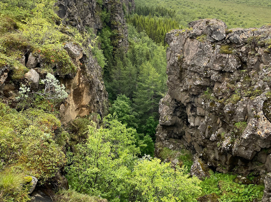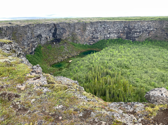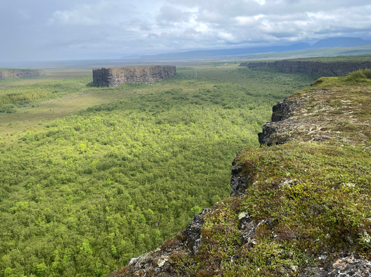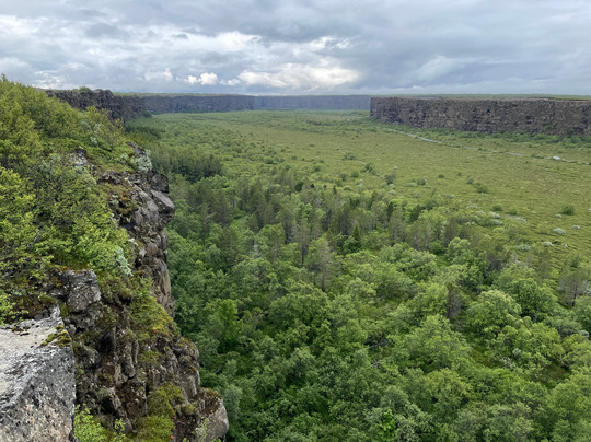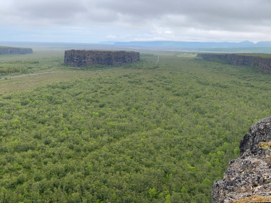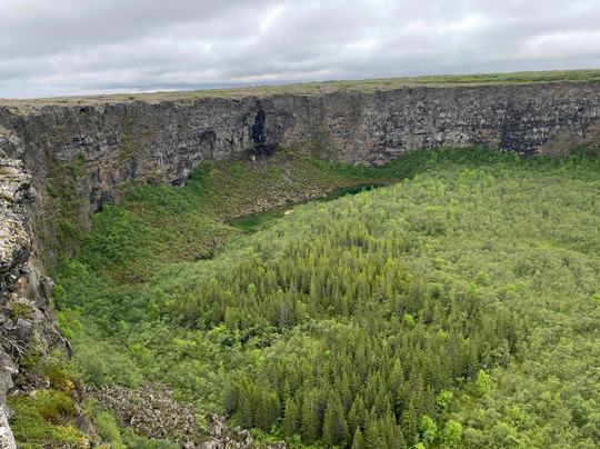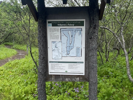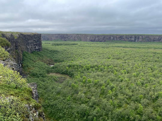 There is a Visitor Centre with free carpark and toilets where you will find a handful of trails leading into Asbyrgi, a horseshoe shaped canyon with a partly forested valley lined with tall cliffs. There is also a trail that climbs the valley cliffside and allows you to walk the rim to the end of the canyon where you are afforded remarkable downward views of the canyon floor, a tranquil lake and forested area.