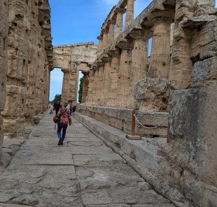 Paestum archaeological park isn’t huge and is flat, except for slight down slope after the ticket office, although it’s not a steep decline. The only steps I remember are 4 that allow access to the Temple of Neptune/Apollo/Hera II, but they are quite high. I have hip troubles but was able to ascend and descend by choosing my path carefully. Even if you couldn't get up the steps you still have a pretty good view of the structure.