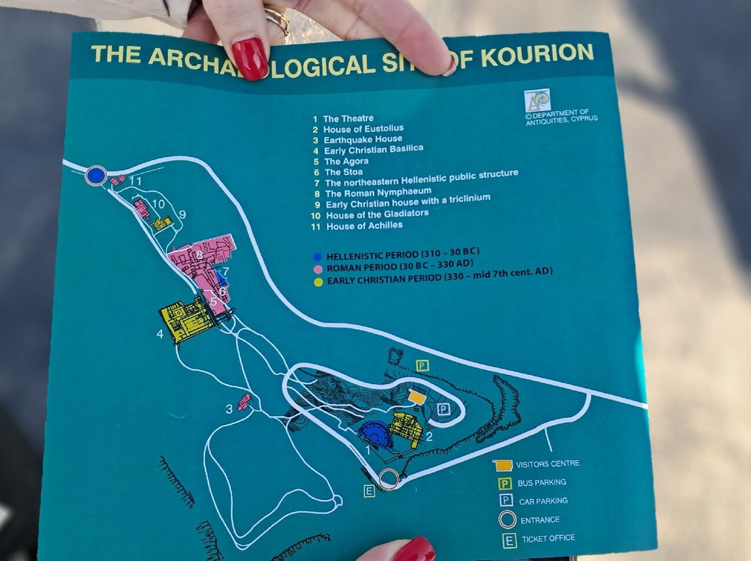 翻译:该遗址位于英国海外领地内。购票后驾车通过闸门即可进入。驾车上山,停车场就在那里。虽然驾车需要爬一段陡坡,但遗址本身地势相对平坦,只是地形有时崎岖不平。这是一座古城,其历史可追溯至公元前5500年。公元365年至370年间,经历了五次地震,其重要性逐渐下降,最终在阿拉伯人的入侵下彻底消失。使用手推车游览遗址并不方便,建议在入口处索取地图,或者至少拍摄一张图腾柱上的地图。请注意阿喀琉斯之家;如果您想欣赏其中的马赛克镶嵌画,必须先经过角斗士之家,然后前往入口处。离开遗址后,您可以停车参观位于围栏外约半公里处的体育场。体育场的大部分大理石已被盗走,但其轮廓依然清晰可见。