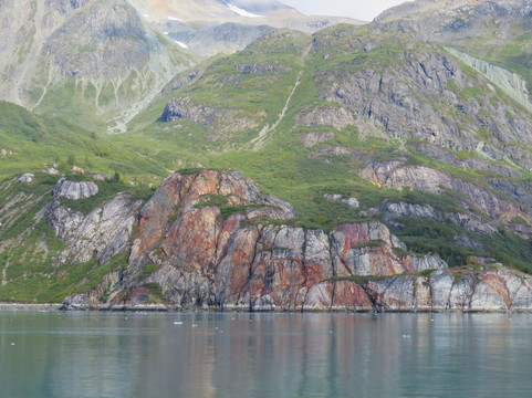 #112 约翰霍普金斯冰川位于同名海湾的尽头。这是这次旅行的亮点,在一个罕见而晴朗的阳光明媚的日子。它有 1 英里宽,高出水面 250 英尺。它还延伸到海床深处,用一堵水下冰碛墙保护着它的水下海冰。它还有“条纹”;侧冰碛沿着冰川的长度延伸。以莱特兄弟命名的奥维尔山和威尔伯山就在它后面。这是一个前进的潮水冰川。#112c 是一张类似的照片,只是左边还有另一艘大型游轮。我很欣赏这种大小比较。114,114b Gloomy Knob 是一块大部分是贫瘠的岩石,由热带地区水下形成的白云石组成。构造运动把它带到了现在的位置。115 115b 拉塞尔岛沿岸的海岸线和 b,有一条冰川融水流。116 对比色的岩石;在绿水的映衬下美丽极了。117 海上日落