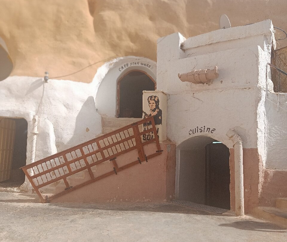 吉普车把我们带到了荒无人烟的星球大战电影拍摄地,所以,当我们买了纪念品并准备返回大巴时,我们惊讶地看到一个只穿着短裤、盖着破毯子的男人出现在我们面前。除了沙子和这个独自行走的男人,什么也没有。我们的司机给了他一些水,我们又上路了。