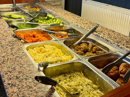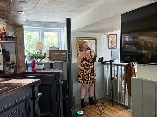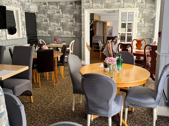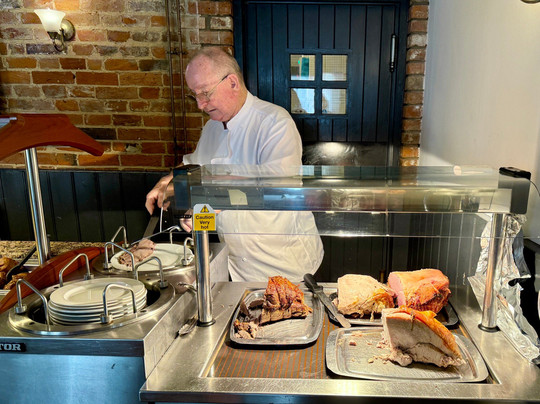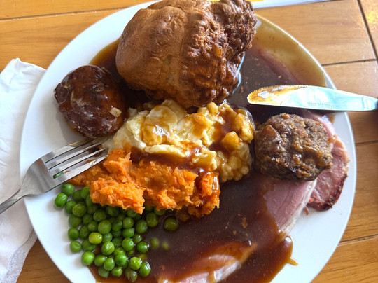 点评:Although our experience did not start off well, we would definitely return again. Our reservation was for 11 people and a dog. We were promptly seated in the back room and were ready to order. After a long time, a lady came to inform us, that we can not sit there with our dog, that dogs are welcomed only in the front room. More waiting. After at least half hour, we were seated around several tables in the appropriate room, and being from the US, we waited for someone to take our drink order, by now the kids (5) were restless. No one came to explain the order and pay system, we finally saw a sign at the bar. More waiting followed, we had to choose food and pay for it at the bar as well. All this confusion made us regret coming here, however after having a drink and seeing the carvery and veg choices, we relaxed and were able to enjoy an absolutely delicious Sunday roast. Portions served were plentiful, the meat tender and juicy, the nut roast was liked by our vegetarians. We had also enjoyed the live entertainment, a lovely lady with a very beautiful voice and we stayed around for additional half hour listening to her. The pub is in a convenient location with plenty of parking, and a quaint old church nearby if you fancy a short postprandial walk.
