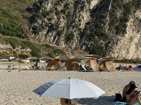 The beach is not commercialized, so aside from restrooms, there are no other facilities. If you don’t manage to grab one of the few available sunbeds, you’ll need to bring your own umbrellas and chairs/sun loungers. Facing the sea, the right side of the beach has fine white pebbles/sand, while the left side is more gravelly and close to the cliffs, with clear warning signs about possible rockfalls. I will never understand why people still place their towels and umbrellas directly beneath those cliffs.