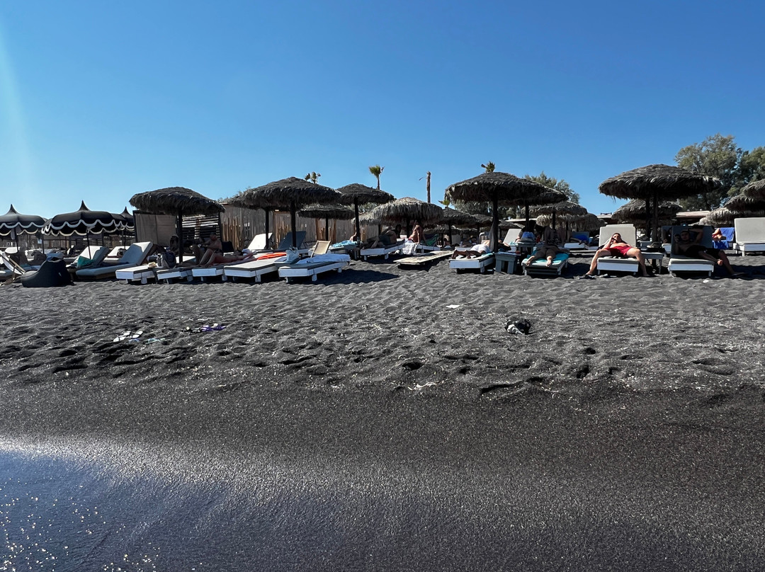 翻译:2025年8月,我们把佩里沃洛斯海滩作为圣托里尼之旅的第一站。我们太喜欢这里了,以至于在旅程的最后一天又去了一次。这片海滩拥有清澈如丝的海水,没有一丝石子,景色优美,几乎没有风,还有令人惊艳的粗粒黑沙。沙子的粗细恰到好处,既不会粘在皮肤上,感觉很干净,又足够细腻,走在上面很舒服——至少在不太热的时候是这样。海滩上一点也不拥挤,让人感觉安全、平静、放松。海滩的每一段都由一家餐厅管理,提供躺椅和遮阳伞,但使用条件各不相同。我们很幸运地来到了South Wind餐厅区域,只要购买饮品,就可以免费使用躺椅和遮阳伞。当然,我们很乐意点了饮品,搭配他们美味的食物。工作人员非常友好,还帮我们找到了停车位。