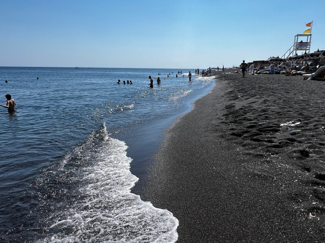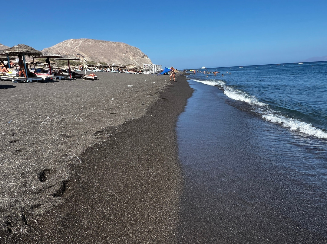 点评:We visited Perivolos Beach as our first stop on Santorini in August 2025, and we loved it so much that we returned again on the last day of our trip. The beach offers crystal-clear, silky water with no stones, beautiful views, very little wind, and amazing coarse black sand. The sand is coarse enough that it doesn’t stick to your skin and feels clean, yet still fine enough to be a sand and pleasant to walk on - at least when it’s not too hot. The beach was not crowded at all and felt safe, calm, and relaxing. Each stretch of the beach is managed by a restaurant offering loungers and umbrellas on different terms. We conveniently landed on South Wind restaurant section and got free loungers and umbrellas with a drinks purchase condition. Of course, we happily ordered drinks along with their delicious food. The staff was very friendly and also helped us with parking.