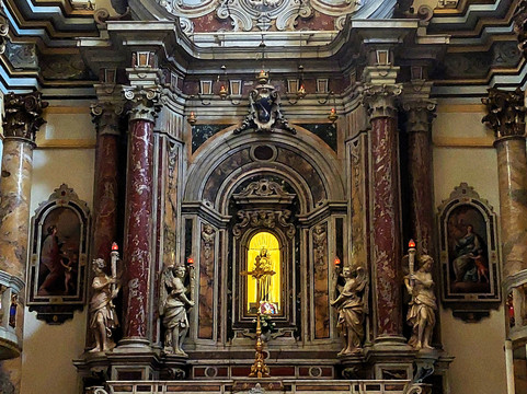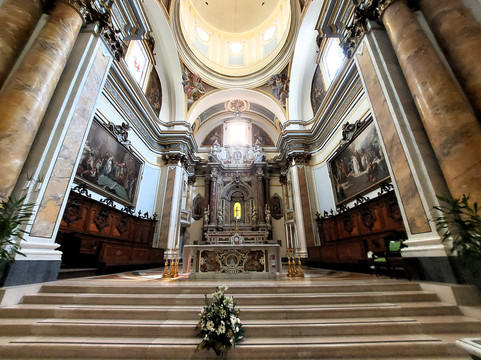 翻译:教堂的历史可以追溯到14世纪末,15世纪期间不断扩建和修缮。它在 17 世纪经历了第一次重大内部整修,当时它成为一座大教堂,旁边矗立的大型钟楼可以追溯到这个时代(所谓的市政塔),现在是独立的,但过去与教堂的门廊,直到18世纪最后20年和19世纪前20年之间被完全重建(但立面的上部直到1950年代才完成,当时圆顶也被重建) 。这座教堂的独特之处在于它的地基建立在戴克里先桥上,该桥的一部分被纳入其中,特别是古老的中世纪桥梁。教堂的正面实际上是不可见的(除了鼓室),因为它前面有一个由柱子支撑的雄伟门廊,在柱子的前面,支撑着四根带有复合柱头的大柱子,这些柱子通过花彩“连接”在一起,支持檐口突出;上面是一个带有小柱栏杆的露台,栏杆上间隔放置着大花瓶和尖顶。应该指出的是,虽然它不包含任何伟大的杰作或具有显着价值的元素(除了下面详细报道的内容),但整个内部立即给人留下了良好的印象。单一的长而宽的中殿被成对的镀金大柱分成三个开间:每个开间都有一个新古典主义的祭坛,有一定的宏伟,但不是特别精心制作,而且也是假的彩色大理石,除了第二个开间。右边是一座真正的小教堂,有着浓郁的巴洛克风格的装饰;所有祭坛上都配有大型 18 世纪画作,除了教堂中的那幅 1601 年的画作(托马索·亚历山德里诺·迪·奥托纳的《最后的晚餐》)。在分隔三个海湾的柱子上有壁龛,里面有圣人的雕像。中殿最有趣的部分是拱顶,由一连串的假椭圆形圆顶组成,由那不勒斯画家贾辛托·戴安娜 (Giacinto Diana) 在 18 世纪绘制了壁画。圆顶上方的大型长老会也值得关注,因为它有雄伟的高坛,其壁龛里安放着受人尊敬的圣母玛利亚·德尔庞特 (Madonna del Ponte);合唱团座位上方的侧壁上挂着大画布。柜台立面小唱诗班阁楼里的管风琴很现代。