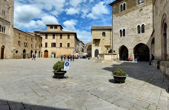 漫步于街道之间,您将抵达翁布里亚最美丽的广场之一——西尔维斯特里广场。广场形状奇特,拥有一座十九世纪的喷泉和一根罗马式圆柱,俯瞰着三座罗马式教堂(圣米歇尔教堂、圣西尔维斯特罗教堂和圣多梅尼科教堂)以及雄伟的康索利宫(Palazzo dei Consoli)和托尔蒂剧院(Teatro Torti)。