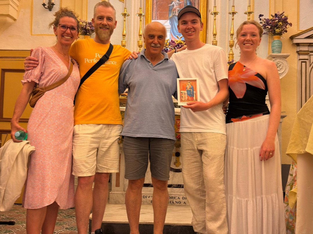 不过我们很幸运,另一个家庭预订了Giovanni的行程。他下来的时候问我们想不想一起去。他只会说意大利语,但用手机翻译,效果非常好。他带我们上山,进入一个钟乳石洞,给我们讲解了洞里的历史,然后带我们去了我们特意参观的教堂。