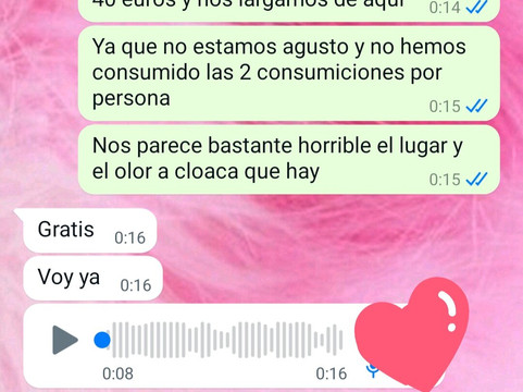 我们告诉门口的女孩,我们不太舒服,我们想离开,但我们不想失去 40 欧元,可以退款,因为我们最多只在里面呆了 15 分钟,而且我们还没有消耗任何东西。他告诉我们什么不是。用一种不愉快的语气......我们让他和老板说话,他说他不在那儿,他不在那儿是件好事,因为老板要和我们说话并对我们不好,而我们要去发现......然后一个漂亮的看门人来了,咄咄逼人*和自大*,他告诉我们他要把我们赶出去,他不会再让我们进去了,所有这一切都是因为我们要求他退款并看到他拒绝退还我们的钱,并向他索要投诉表!当我们要求索赔时,表现得令人不快的“经理”告诉我们,没关系,她会把它交给我们,但我们应该寻找我们的生命,因为她不会给我们留下一个笔来填写。最糟糕的是,他们抢走了我们 40 欧元购买的 4 张门票,门卫叫我们滚蛋。它不再属于我们,因为我们不会使用它,所以他们不会把它还给我们,他们会把它给别人。好吧,“经理”唯一说的是,我们必须没有门票,没有钱,这就是他们所做的......他们拿走了我们的门票,把我们赶了出去,并对我们说了一些残暴的话!