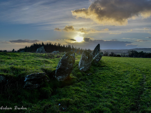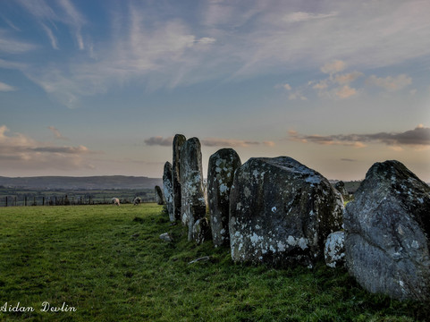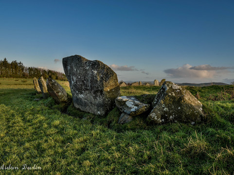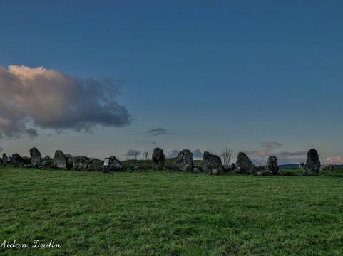The enigmatic stone circle is situated on the summit of Tops Hill 170m (350Ft) the circle having a diameter of 44.2m (145Ft), a circumference of 137m (449Ft) with 64 stones, ranging in height from 0.3m (1Ft) to 2.7m (9Ft), although there were probably about 15 to 20 more stones originally, 80 in total. Enclosing an earthen platform the centre has been greatly disturbed and most likely the result of unscientific attempts at excavation by locals or for available loose stones to build farm buildings and field walls. This evidence was provided orally and recorded in the Ordnance Survey Memoirs of 1836 where it states, 'locals recalled the removal of vast heaps of stone and sepulchral type graves with bones'. If the center of the stone circle once held a cairn or passage tomb, then the stones of the circle may be considered remnants of the tomb’s kerb.