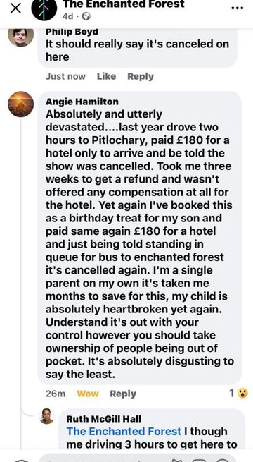 What was more upsetting was that the customer had travelled to Pitlochry and paid £180 for a hotel last year to be told it was cancelled. They repeated the trip this year, and the same happened again. This post has been deleted from their page.