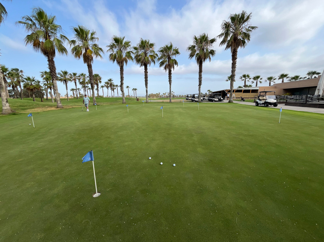 前面有一个果岭和一个带网的练习场。