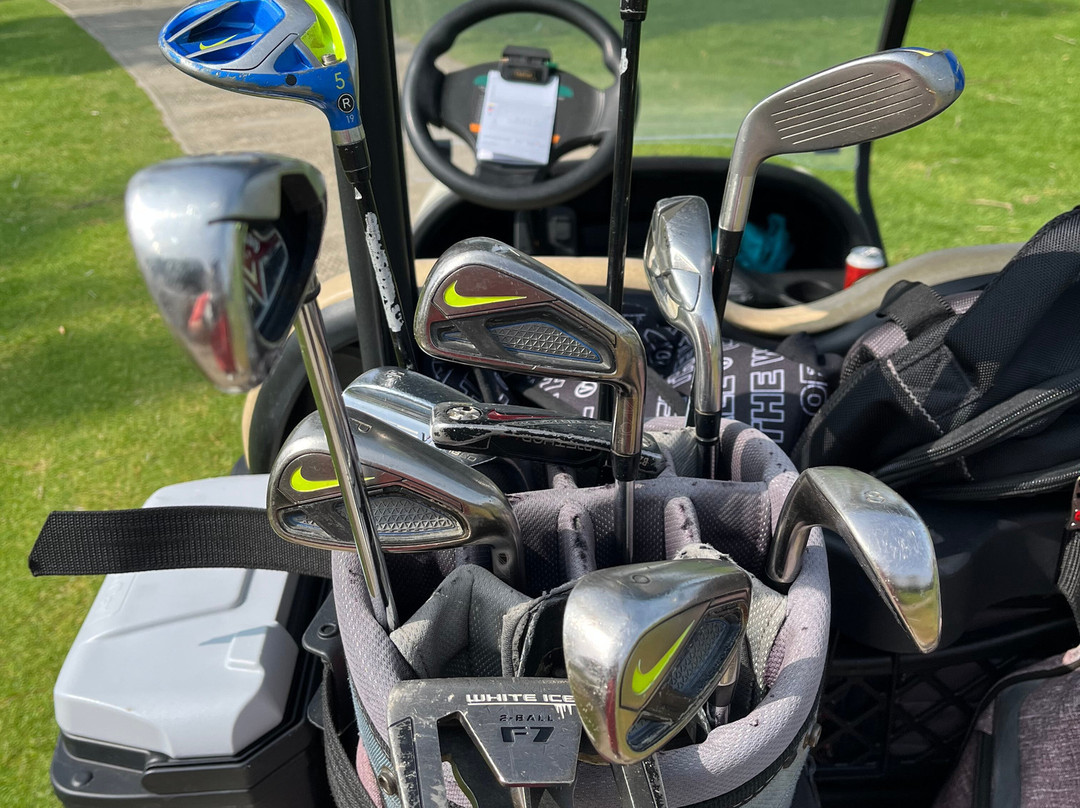 标准租赁球杆是耐克的,有点破旧了。我们打了一轮球,还是用耐克的,但要多花10欧元才能租到新款的卡拉威球杆。